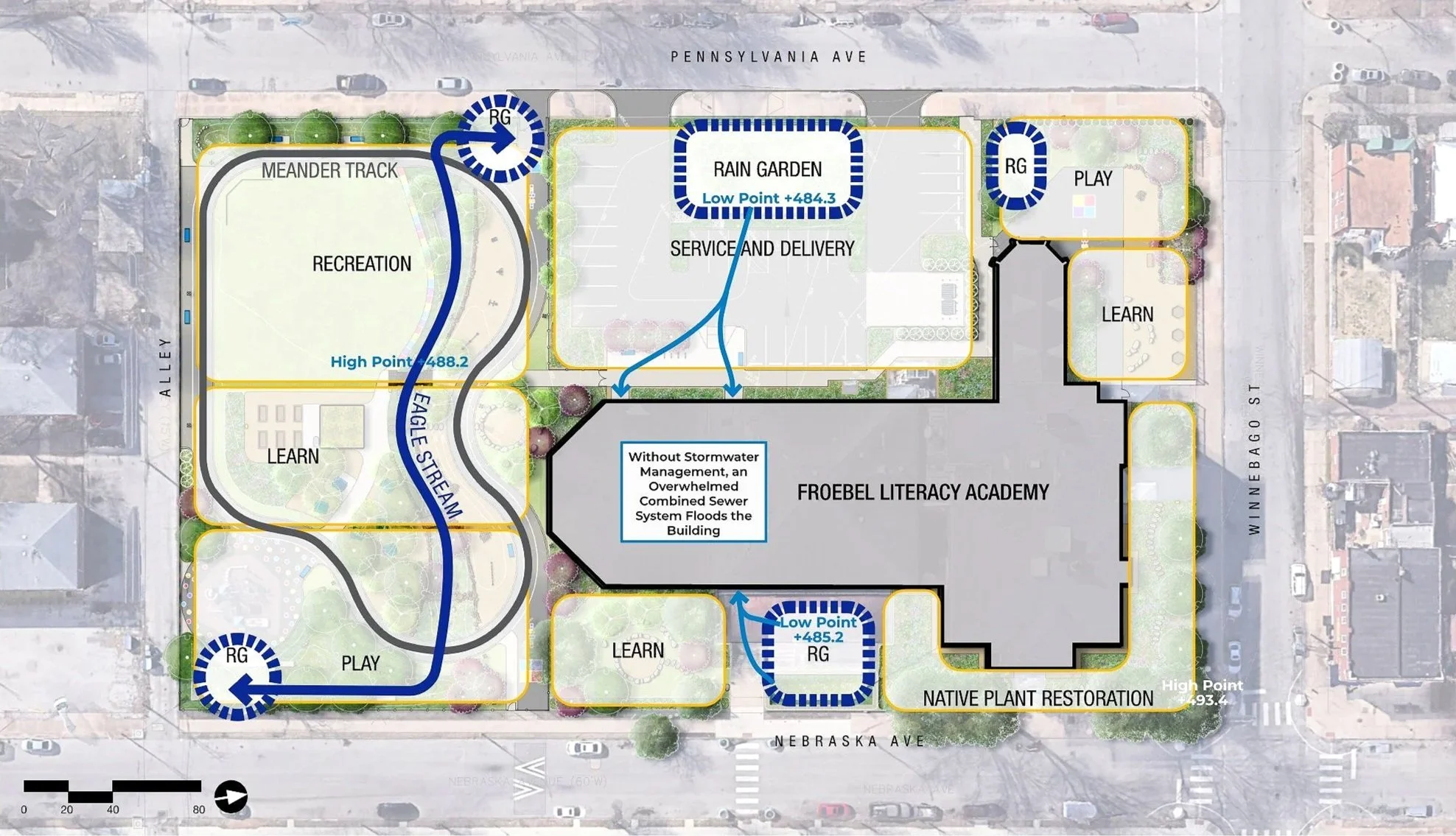 Green Schoolyards offer vibrant, multi-functional spaces where students can learn, explore, play, and unwind while supporting their mental and physical health. At Froebel Literacy Academy, the story of stormwater is integrated as both an educational and experiential element, enriching students’ daily interactions with their environment.
