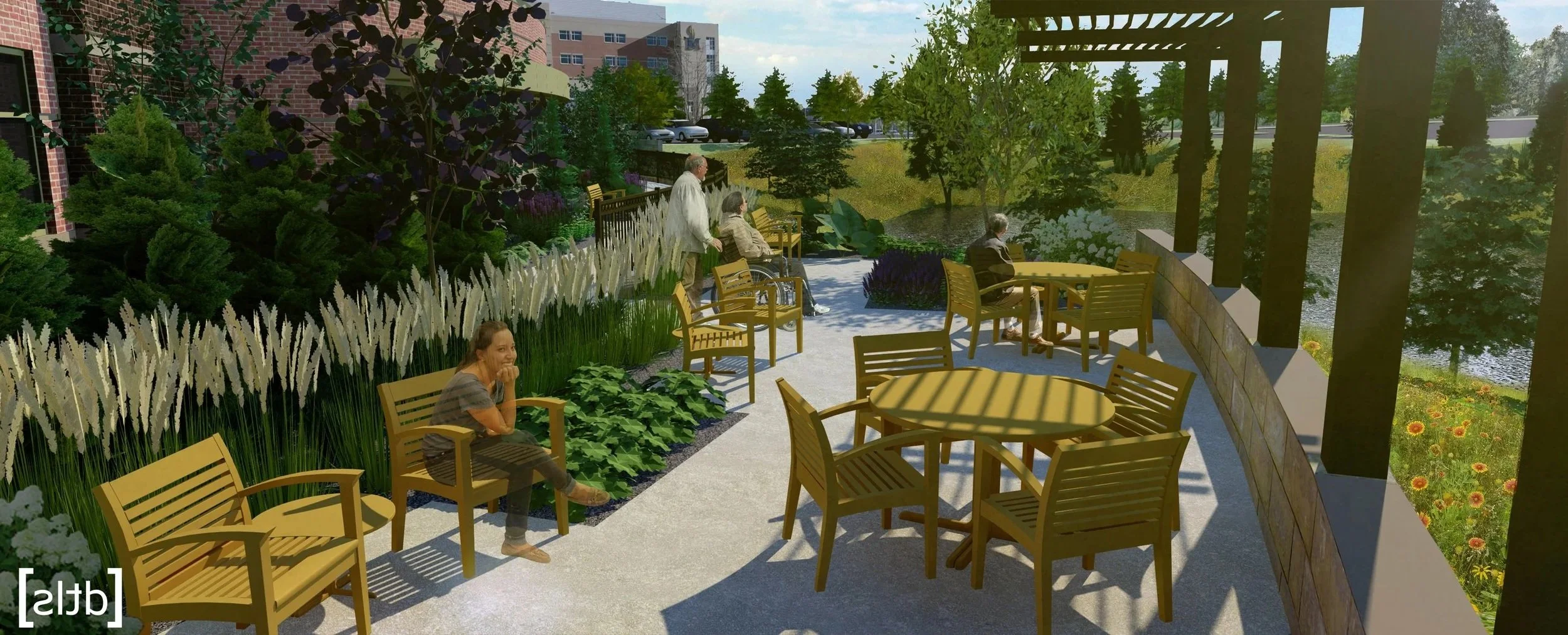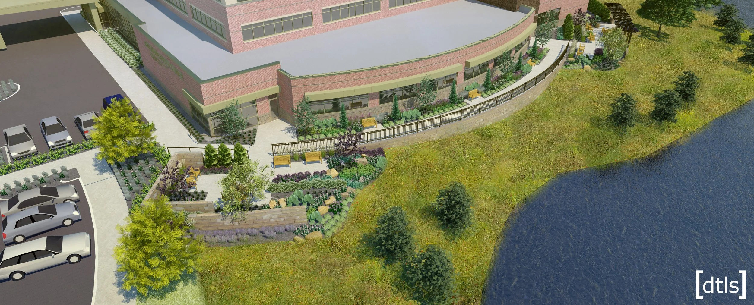 DTLS designed an outdoor amenity space adjacent to the patient rooms, overlooking the lake beyond. The design intent was to create a peaceful respite for visitors and patients undergoing treatment. The layout of the amenity space offers sightlines to the lake along a curving pathway as well as smaller, intimate places to sit and relax. Native landscape plantings create wildlife habitat and feature an array of wildflowers which are continuously changing with the seasons.