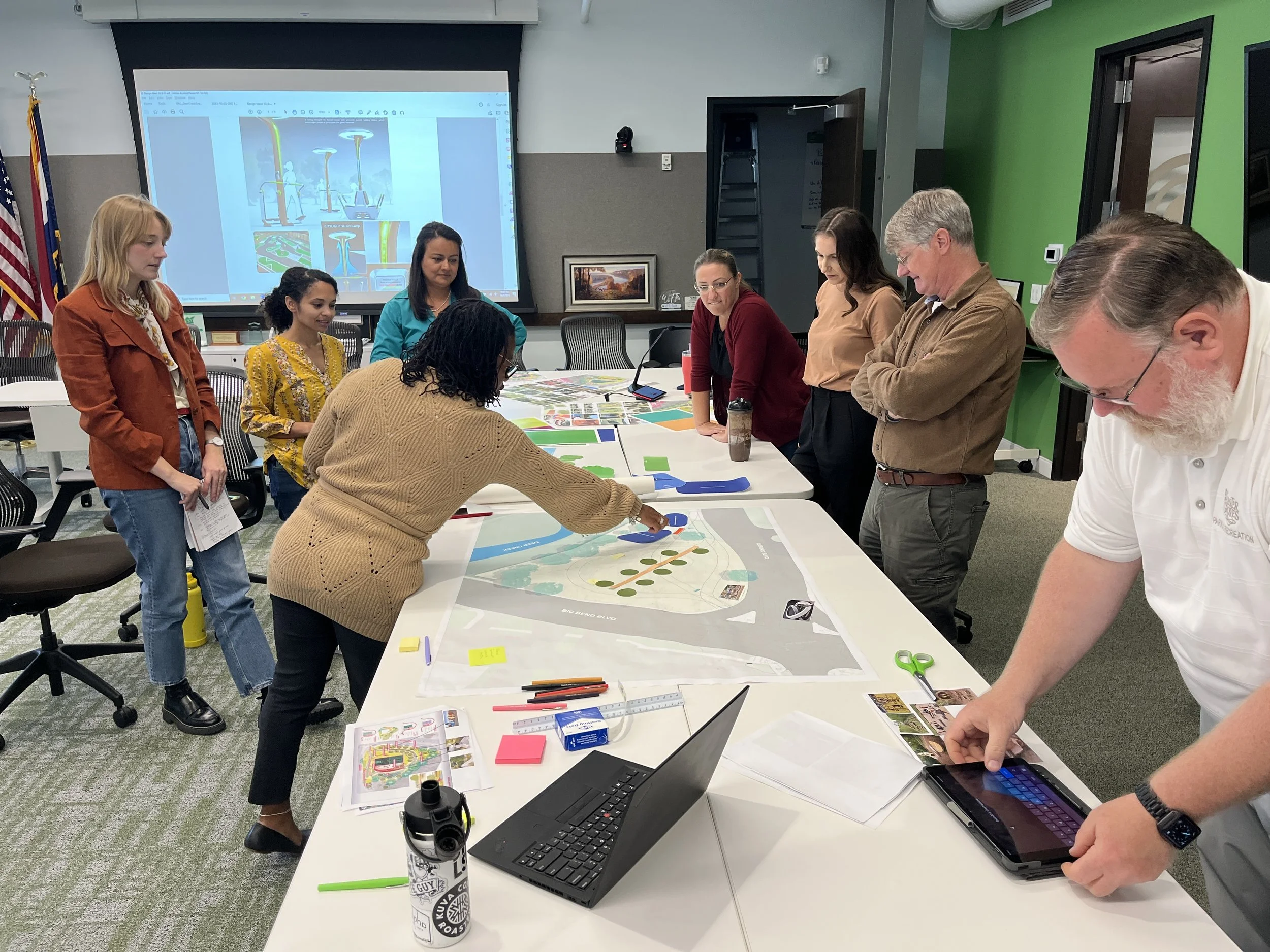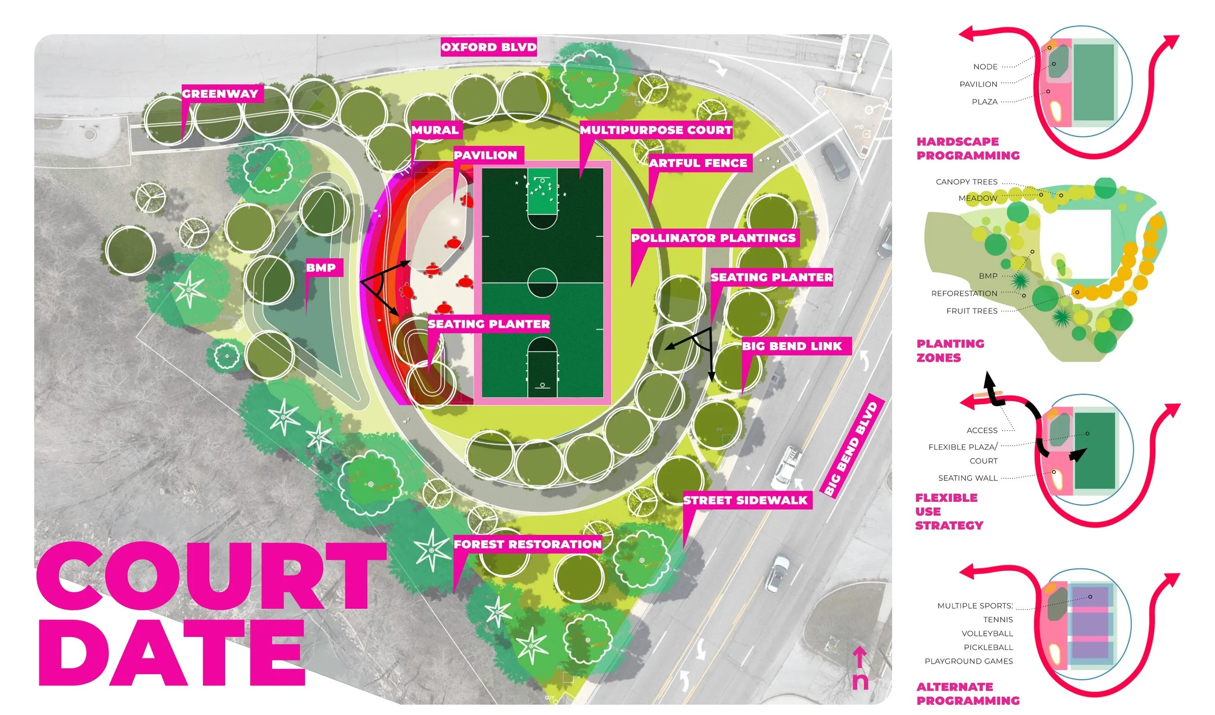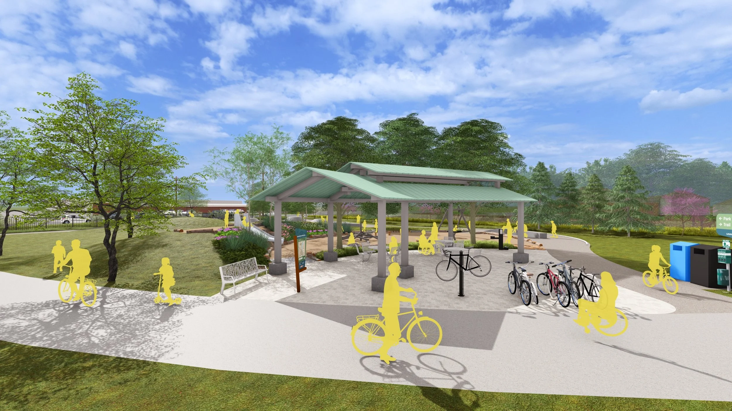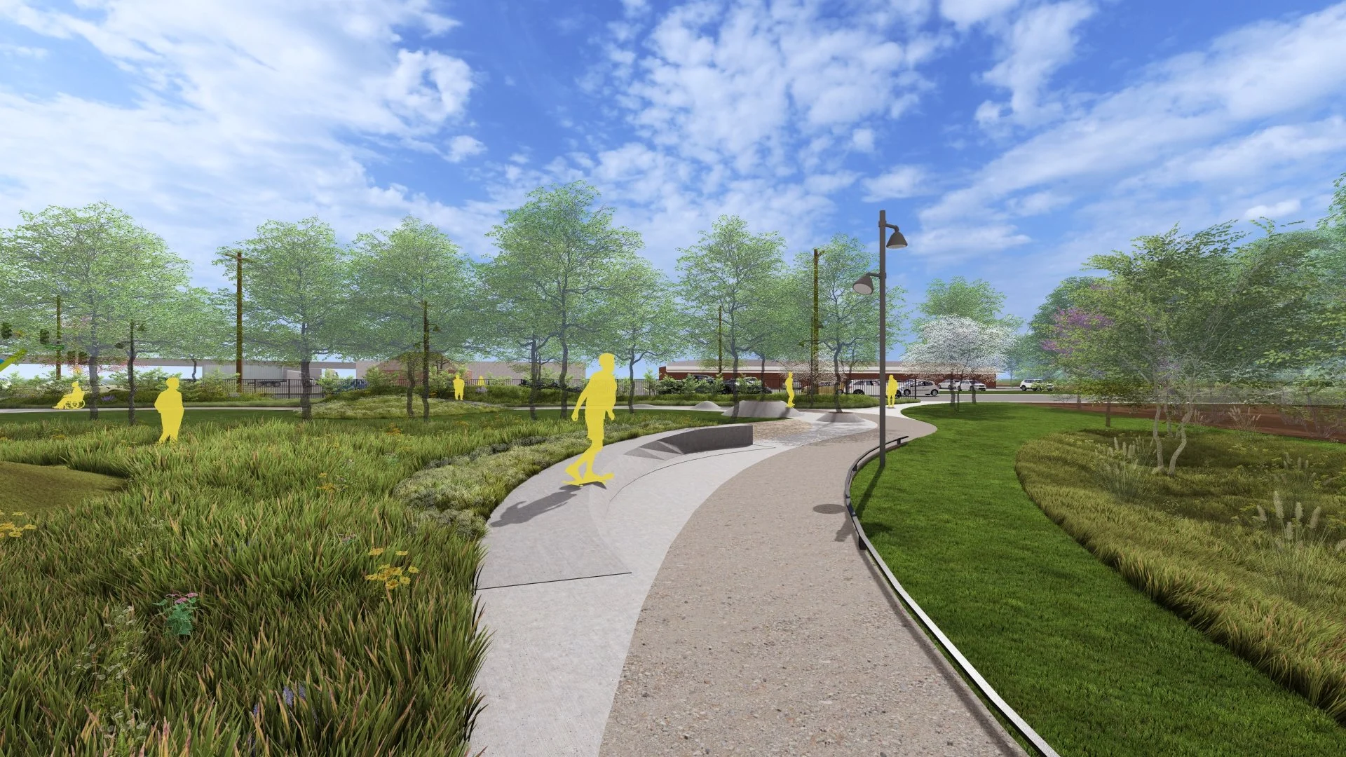 The park’s design process has been driven by community and stakeholder feedback, and included a design collaboration with a Washington University architecture studio class. Feedback prioritized nature-based play, skateable elements, open greenspace, shade, native plants, and art.