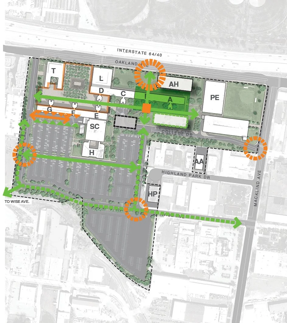 A holistic approach to the campus was required in order to provide meaningful recommendations which strengthen the campus , because the student experience is not limited to one new building. The master plan ultimately outlined 15 individual projects and provided cost estimates for each for the purpose of future budgeting. The foremost project opportunity identified was to create a new north-south campus entry from Oakland Avenue. This entrance, complete with campus identity signage, would create a new prominent address for the campus, simultaneously strengthening and complementing the primary east-west pedestrian circulation route. This recommendation has been incorporated in the final design of the Center for Nursing and Health Sciences building.