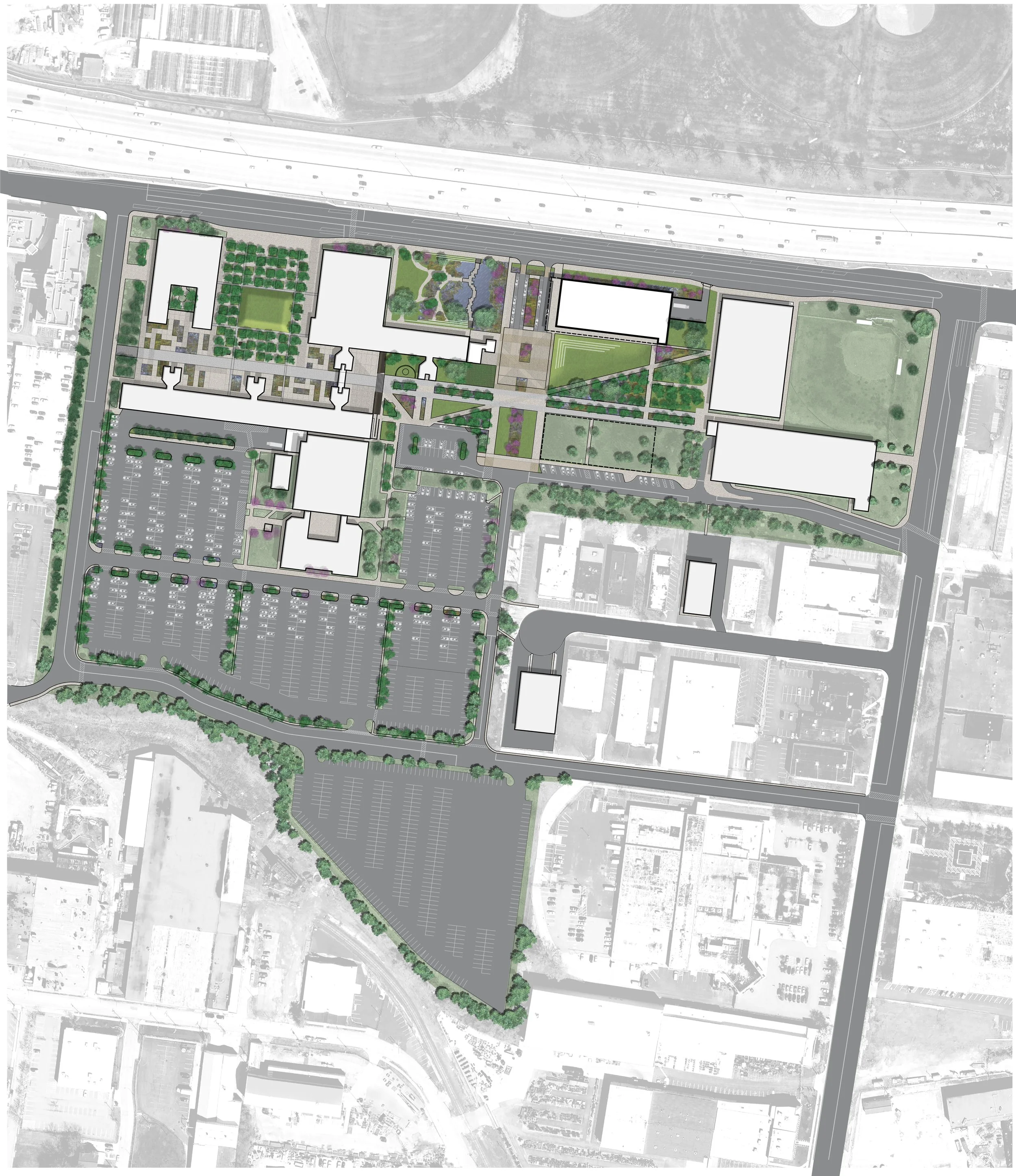 The proposed removal of these two towers would significantly alter the campus design, which was originally arranged as a continuous bar of interconnected buildings, ushering in a myriad of new possibilities for the eastern half of the campus. The primary focus of this planning effort was to study how the new building, and removal of the old, might positively impact pedestrian connectivity, vehicular circulation, open space experience, and landscape identity. Additionally, many of the exterior spaces beyond the limits of the Center for Nursing and Health Sciences building were showing signs of decline. The design team identified these spaces as candidates for future investment, to be developed as functional spaces which encourage interaction with nature, increase student and staff retention, and strengthen campus identity.