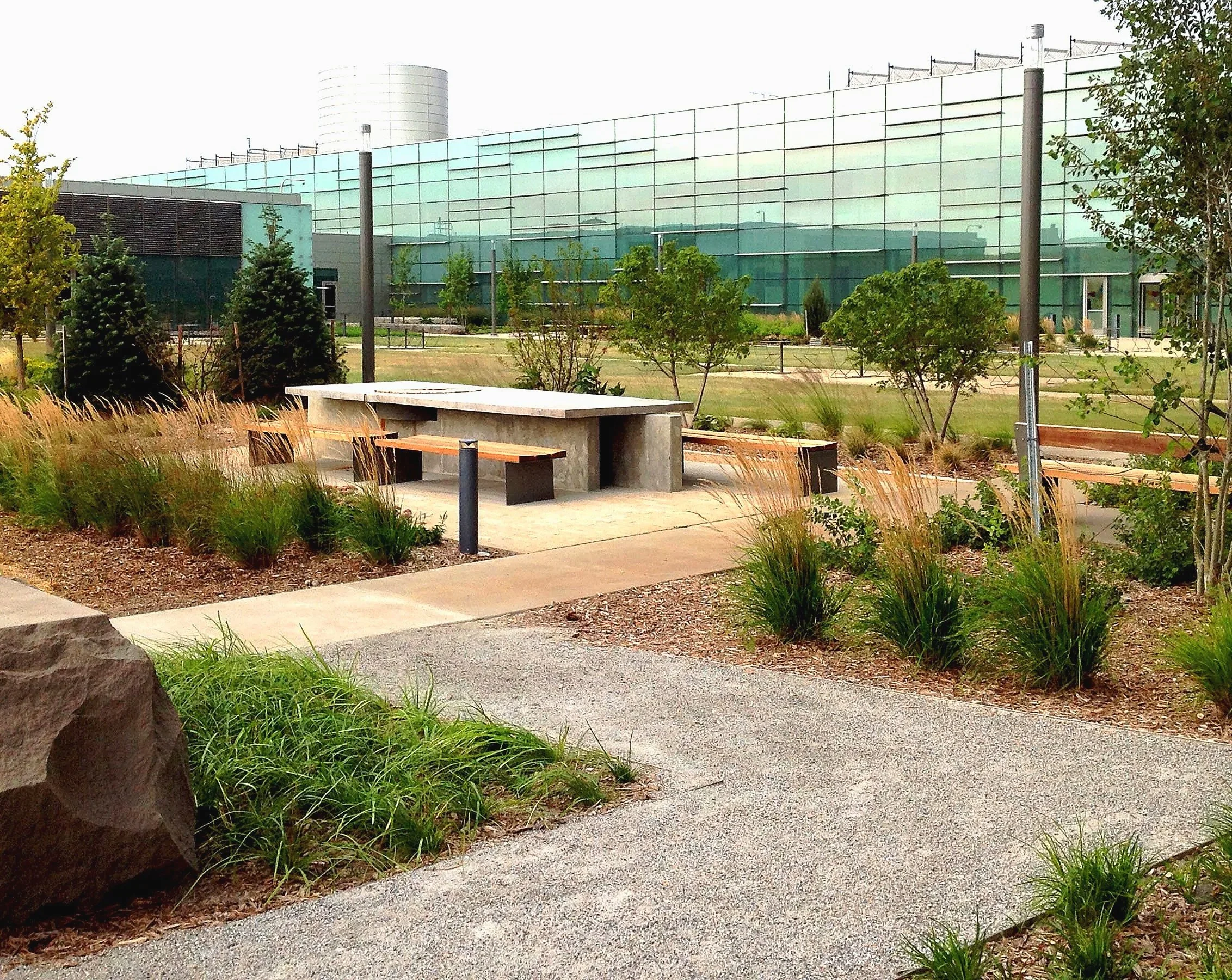 The health and well-being of the associates is central to the design of the campus landscape. The design promotes engagement with the outdoors through the development of strolling paths offering connections to nearby public trails, bicycle infrastructure and storage. The site also features outdoor activity areas, such as basketball and sand volleyball courts, as well as a 7,000 square foot accessible green roof. A mixture of fixed and moveable furniture allows for flexible use, ranging from individual seating opportunities to outdoor dining, and from small group meetings to large events. Custom harvest tables were designed in collaboration with the Client and feature repurposed millstone collected from the site, a former grain mill.
